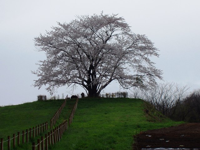 小高い丘の上にある桜で、田畑に囲まれた場所にあるこちらの桜。
