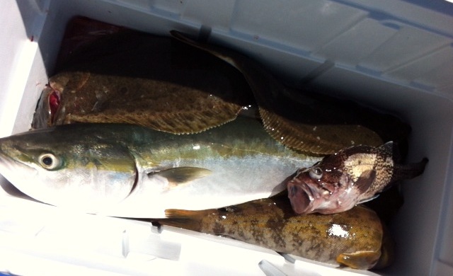 Aさんの釣果は全部で、ヒラメ5枚にイナダが1尾、アイナメも1尾。