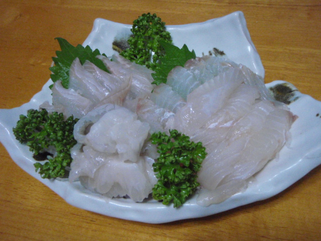 刺身盛の画像、左がアイナメで真ん中がヒラメのエンガワ、右がヒラメの身です。