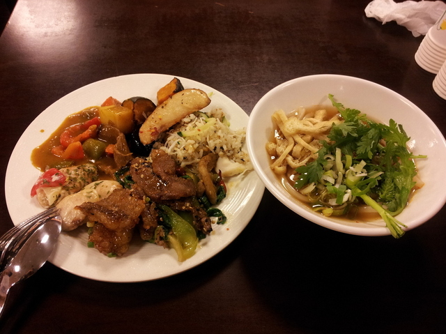 で、中華の”肉と青菜の炒めもん”とか”ピラフ”とか”シチューっぽいのん”とか取って