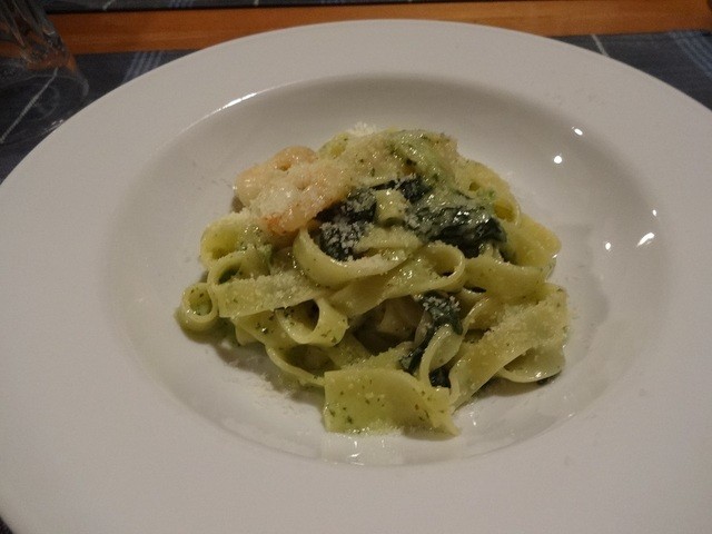 「小エビと帆立貝のタリアテッレ 春菊のクリームソース」と