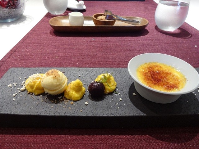 これで一通り終了。残りはデザート。クリームブリュレにマンゴームース?とバニラアイス。散らしてあるのはホワイトチョコのパウダー。これまでのお料理もそうだけど、全体に創作感があふれた感じがしました。これも甘すぎなくて美味しかった。