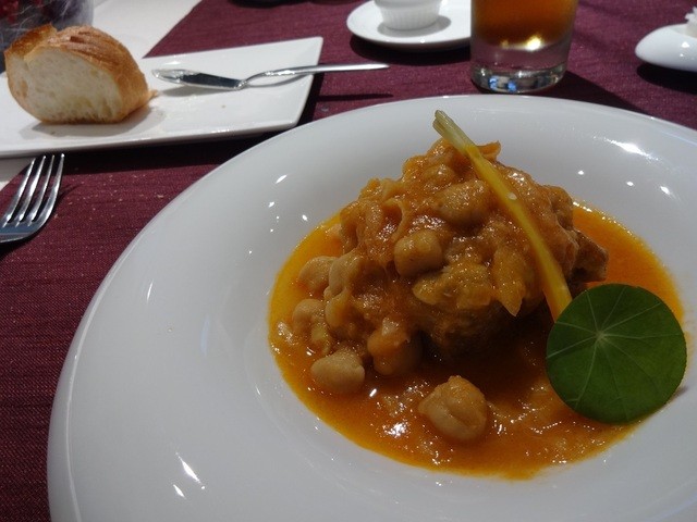 次のメインはお肉。今回は連れに高齢者二人いたので、柔らかい調理をお願いしてあったのだけど、注文どおり豚肉がほろほろと崩れそうに煮て?ありました。タレはひよこ豆の何とか。