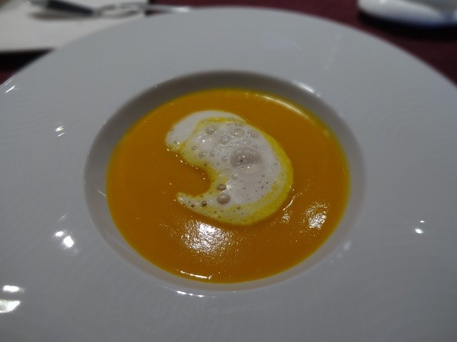 次はスープ。かぼちゃのスープに牛乳を泡立てたのを加えシナモンを振る、みたいなの。シナモンがよくあってました。それと色合いがきれい。