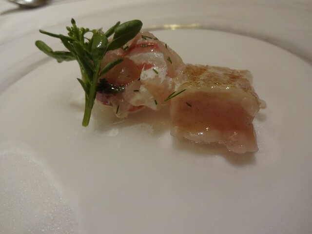 ・イカスミのソーセージ+イカの卵、ワサビの茎を巻いた平目。