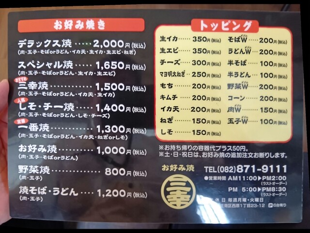東広島で2軒、百名店行ったので、それよか!点高い、ここまで足伸ばしました。12:00過ぎ、駐車場6台あるがあいてない。しゃーないコインパーキング探してうろうろしてる間に20分たって、まいもどると、道向いの、3台は、全部あいてた。店行くと、まあまああいてそう。だが、鉄板希望というと待たされる。椅子でも良いというと、通されてた。しばし待って、鉄板へ。なんか流儀があるのだろう。三幸焼1,500円、玉子は、半熟でお願いした。いくら待たせても接客は女将。大将は、挨拶は、するが、モクモクとつくってる。いいね~。できたら目の前に運んでくれる。コテでいいですか?と聞かれる。つまり、箸はいらないよねってことだが、もちろんいらぬと。ちょっといきがる。一口。うっまー。思わず声が出る。そばのカリカリ感、生イカの歯ごたえ。豚の味。イカ天の、コリコリ。どれもあいまって、最高だ、こりゃ一番だ、きた甲斐あり。いわゆる街中、飲み屋街でもなく、わざわざになるが、車があるならぜひ行くことを強くオススメする。百名店当然だ