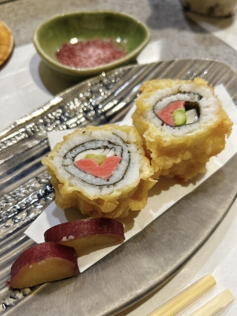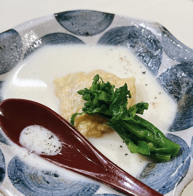 ハモで、アスパラと生麩を巻いてあるのかな?