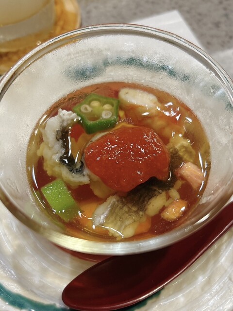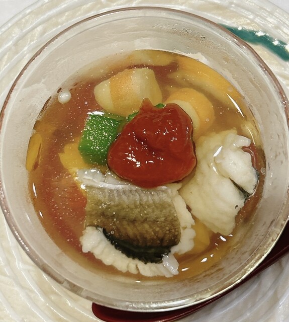 鱧、トマト、オクラ、とうもろこし、エビが入ったジュレです(^O^)