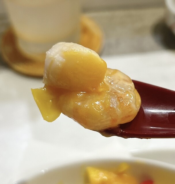 パパイヤ、赤パプリカ、エビ、小柱に白味噌のソースの甘塩っぱさが絶妙!!(๑˃͈꒵˂͈๑)