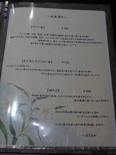 すごい貝(900円)、そんなにすごくない貝(750円)、油そば(850円)とそれぞれいただきました。