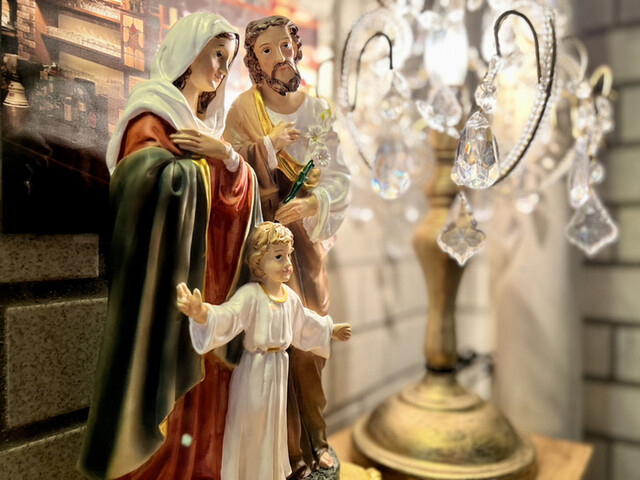 間接照明の柔らかな灯り、教会の屋根裏をイメージした静かで落ち着いた空間で
