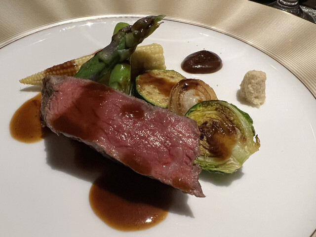 付け合わせは茄子 、大黒しめじ 、アスパラ