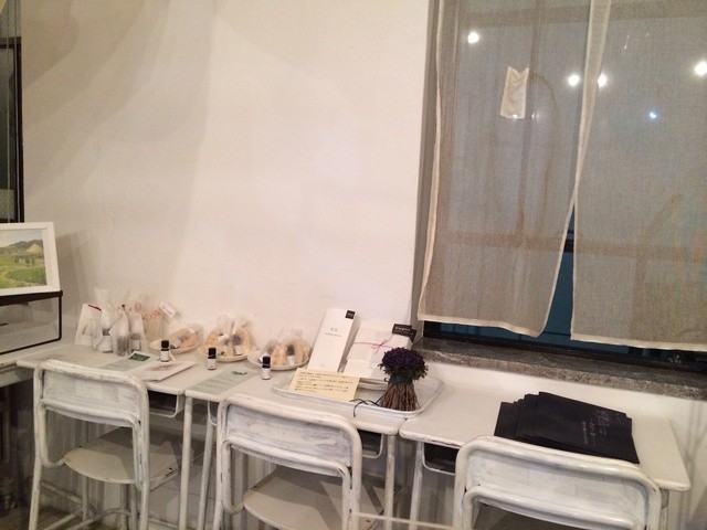 その奥にお茶を飲めるスペースがあり、小学校の机と椅子を白いペンキで塗ってそのまま使っていて柔らかい雰囲気とほっこり出来る空間になっています。
