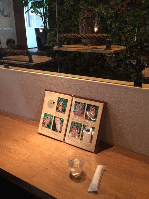 お店の中はガラス張りのフクロウ小屋の前にカウンター。