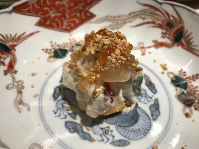 鶏肉、セミドライトマト、柿とマスカルポーネチーズを瞬間燻製した演出は女子のハートをわしずかみですねっ❤︎