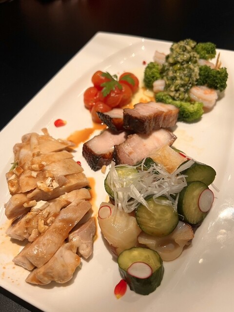 春巻き・海老とブロッコリーの葱生姜ソース・砂ずりのうま辛紹興酒漬け・自家製チャーシュー