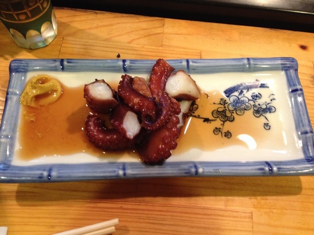 味は確かです。あと、日本酒が充実しています。この日のおすすめは緑川でした。まずは、一品もので、たこの煮物です。味付けと煮込み具合がよかったです。次に大将おすすめの「ひらめのキモ」です。初めて食べましたが、とてもおいしかったです。またまた大将おすすめの鯛、ひらめその他の卵です。これも初めて食べましたが、とてもおいしかったです。にぎりはアジと鯛をチョイス。肉厚がすごかったです。さばきずしはあっさりとした付け具合で、かちかちになってなくて好みの味でした。