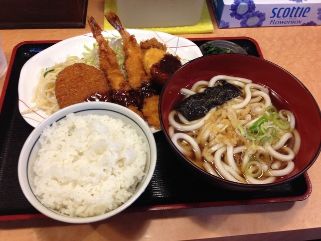 かつては25線沿いにあった「もとや」が場所は違えど、寺田町駅近くに復活しました。メニューは相変わらずです。値段はやはり安いです。この日は日替わりを注文しました。日替わりは2つのメニューがあり、エビフライか塩鯖です。エビフライ定食を注文しました。写真の通りですが、うどんに50円をプラスすると、和風ラーメンにしてくれます。今回はひさしぶりに「うどんは以前のままか?」という確認のためにラーメン化はせずにしました。