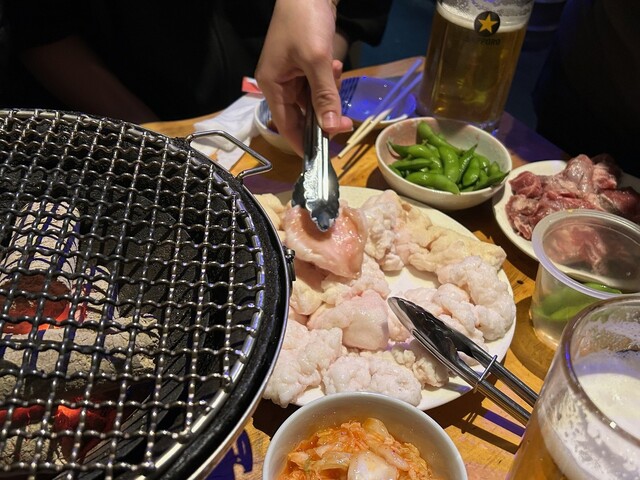 ホルモン (塩)を人数分。最初の1クールは店員さんが焼いてくれて焼き方をしっかり教えてくれる。皮: 脂=8:2で皮から焼く。皮に焼き目がついたところで、ひっくり返し脂を焼きすぎて失わないように、早めに頬張る。甘い香りを伴い、ふくよかな食感ののち溶けて、思わず目を閉じて味わう。皮のみ残り噛み締める。集中して焼き続ける。その後は、ハツ、ラム、ナンコツをいただく。レバーも新鮮。カロリーもおそらく低めで健康的。消火用の水が用意されているが、店員さんが炭を適切に追加してくれるので、そう引火しない。キャベツは味がついていて、肉によく合う。食べることに集中しているのか、お客さんの捌けは早く、21時頃には店内はだいぶん空いた。ごちそうさまでした。必ず再訪します。