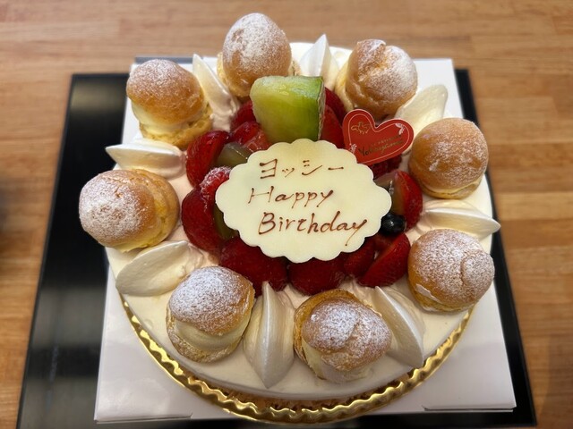 可愛らしいプチシューがあしらわれたバースデーケーキは、見ても食べても満足度の高いものです。