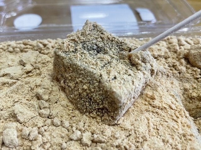 材料は砂糖・わらび粉・黄な粉(大豆)だけの独自製法で作られており、冷やしても硬くなったり