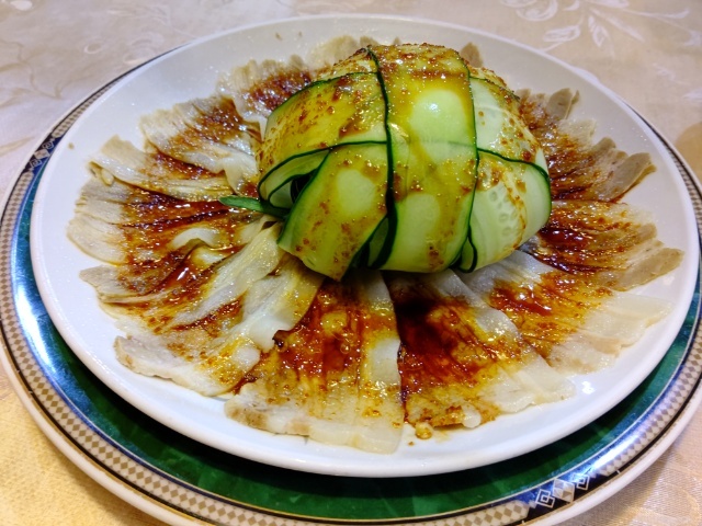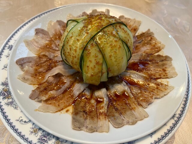 豚のバラ肉を雲に見立てた四川料理らしいですが、付け合わせのキュウリの盛り付けが最高です♪