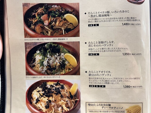 メニューはバリエーションが豊富、゛壁の穴発祥゛だというたらこを使ったスパゲッティの中から、