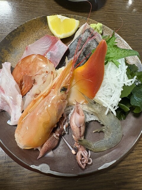 カキの天ぷら、向の利身の盛り合わせご飯、カニの味噌汁、手作り漬物