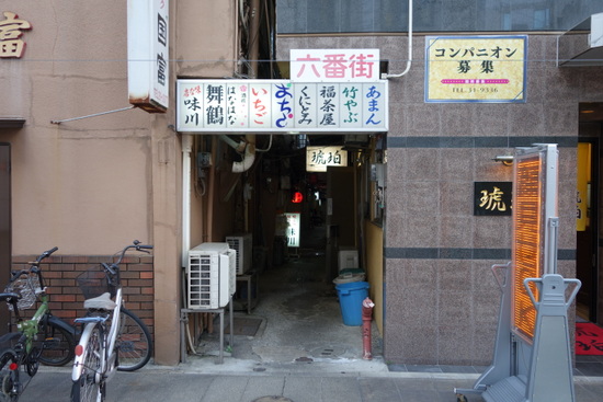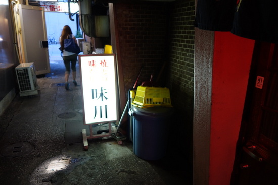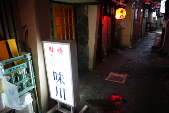 最近、なじみのお店ばかり行っていて、いけないなと思い、2軒目のお店の突入。以前から気になっていた5番街の味川です。B級グルメとして有名なお店と言うことは知っていたのですが、入ってみて、なるほど、と思いました。店内は4席のカウンターとテーブルがひとつ。頑固そうなおじさんが黙々と串を焼いています。B級感一杯の店内です。