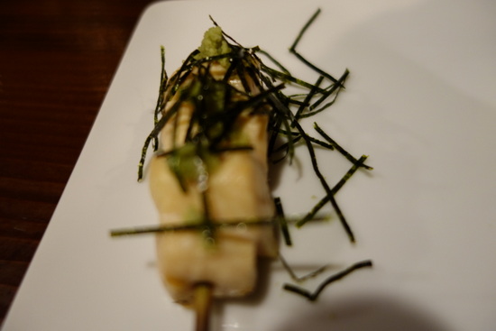助八の串、4本です。これまた驚きました。最近くしを食べる機会は、かなり減ってきているんですが、旨いです。お世辞抜きで旨かった。ここ何年かで食べた串の中で一番旨いうちの一つですね。どうして美味しいのかと聞くと、朝〆の鶏を使っていることと、焼き、塩ですとおっしゃっていました。確かに塩加減、絶妙です。レバーって、普通、冷めると美味しくなかったりするのですが、冷めても美味しい。新鮮で焼きが良くて、味が絶妙。あんまりこのブログで持ち上げてもあれですけど、何の先入観も持たずに食べに行ってみて下さいね。