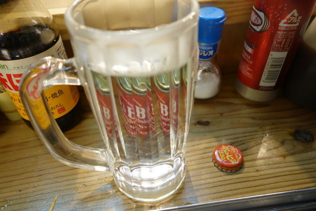 ということで、せんべろで注文。つまみは、串揚げで。アルコールは焼酎を選択。すると2つの王冠がもらえました。それと、おかわりの際交換。なるほど~ 生ビールも選べるみたい。すごいすごい。