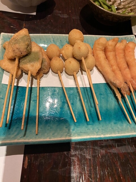 最初に個別の刺盛りが運ばれて、続いてピーマンの肉詰め、アボガドサラダ、椀もの、串揚げ、締めに冷かけ蕎麦。