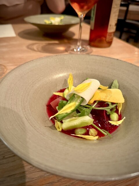 酸味のあるビーツソースに季節野菜を絡めて食べると、サッパリしつつ野菜の旨みを楽しめます。