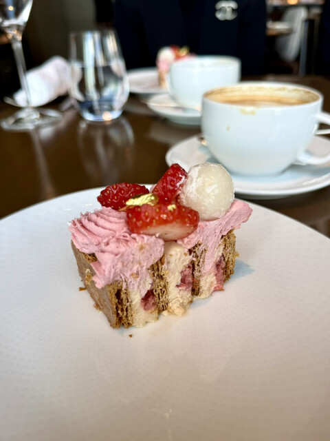 苺のミルフィーユはサクサクのパイ生地、ピンクのクリームは酸味のある苺クリームになっていて最高のバランス。