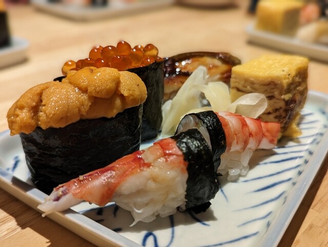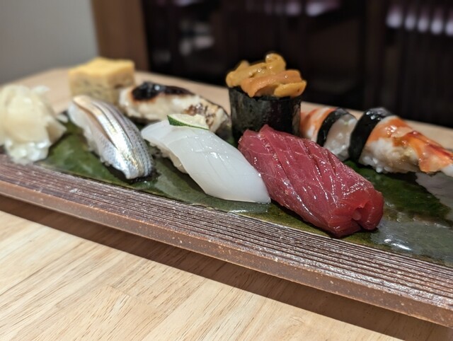 ・おまかせ握り6巻(コハダ、スミイカ、マグロ赤身、玉子、穴子、ウニ軍艦、車海老)