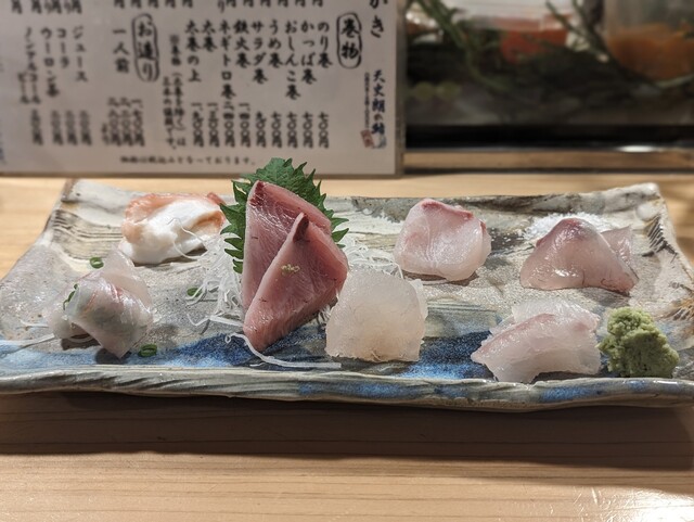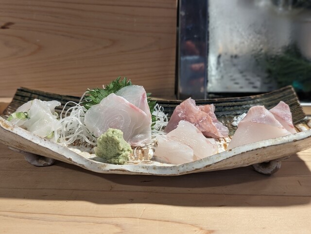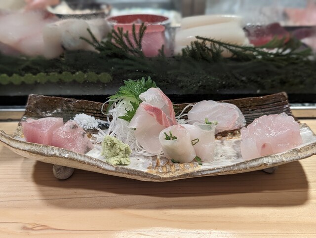 ヒラスズキの細切り、真鯛の昆布〆の角切り、石鯛、カワハギの肝包み、ハタ、ハタの縁側、平目、黒鯛