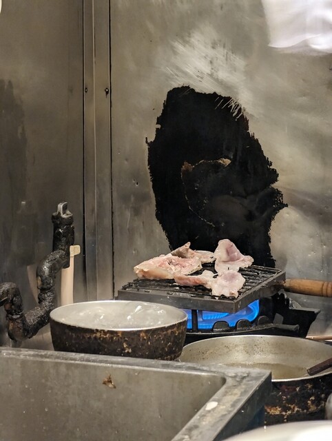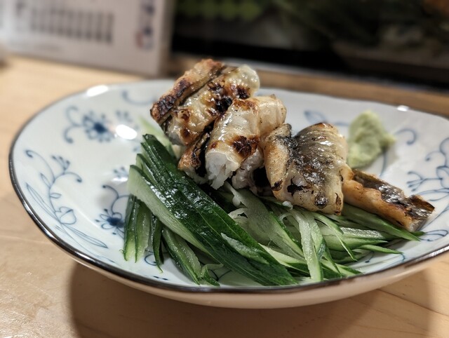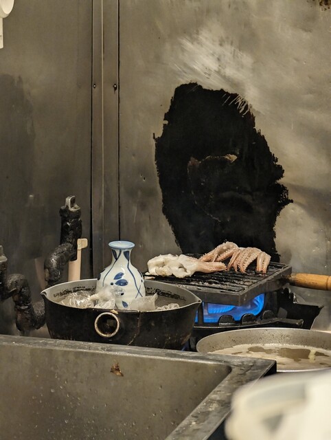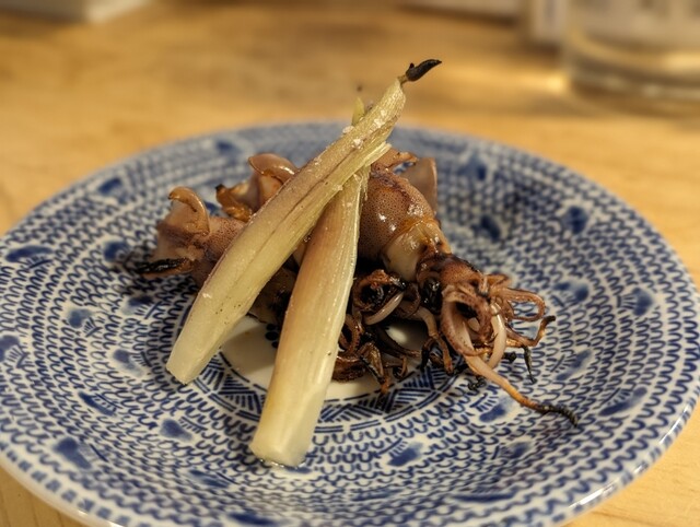 本日のオススメメニューに◎が付いていました。ボイルした胴がパンパンのホタルイカを炙り焼き器(焼き網)で焼いてあります。沢山の干物を焼いた焼き網なので香ばしい香りが付いてさらに美味しく感じました。