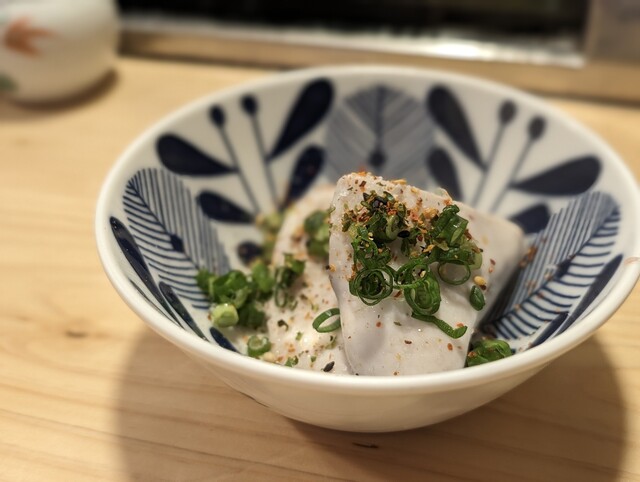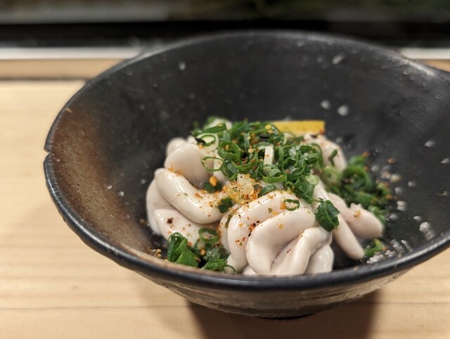 新鮮で淡白なトビウオをピリッと辛い青唐醤油に漬けてあります。漬けにする事で旨味とねっとり感がプラスされて最高のツマミに変身します。
