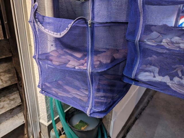 イワシではありません。内臓を出さないで干した天史朗鮨さんの自家製ジンタの干物です。店前の風通しの良い場所で干しています。