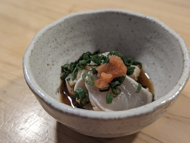 軽く湯霜した身をポン酢と香りのあるかんずりを掛けて頂きます