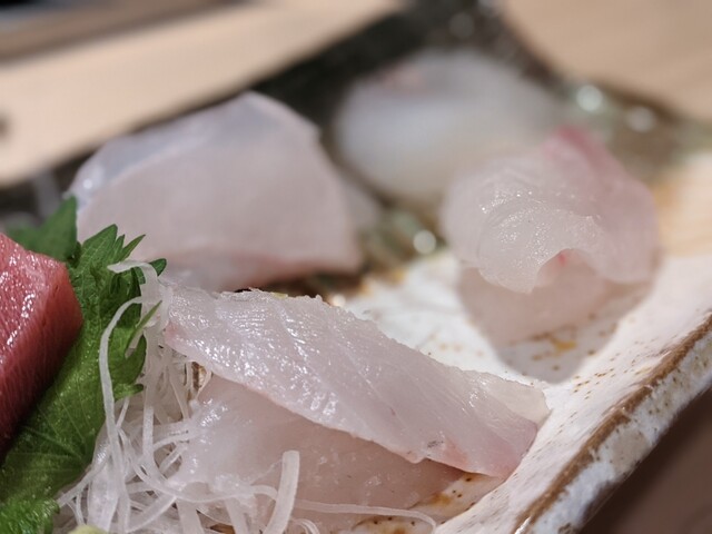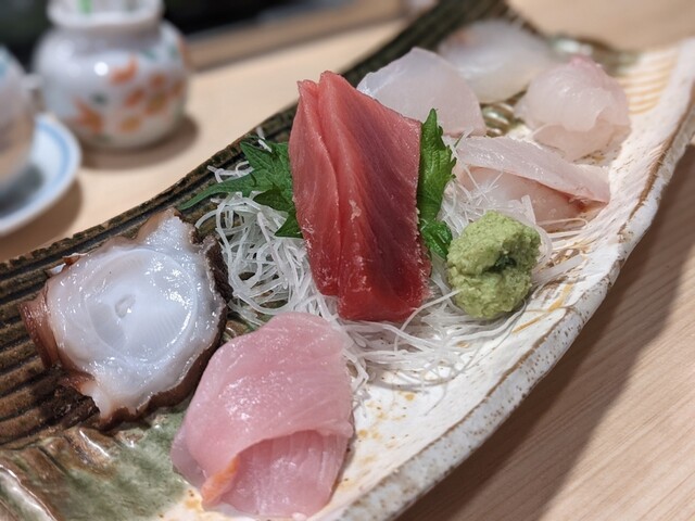 お刺身盛り合わせ(汐子、メバチマグロ、本マグロ、ヒラメ、クエ、ヤガラ昆布締め、イシダイ腹)のクエがめちゃくちゃ美味しかったです。