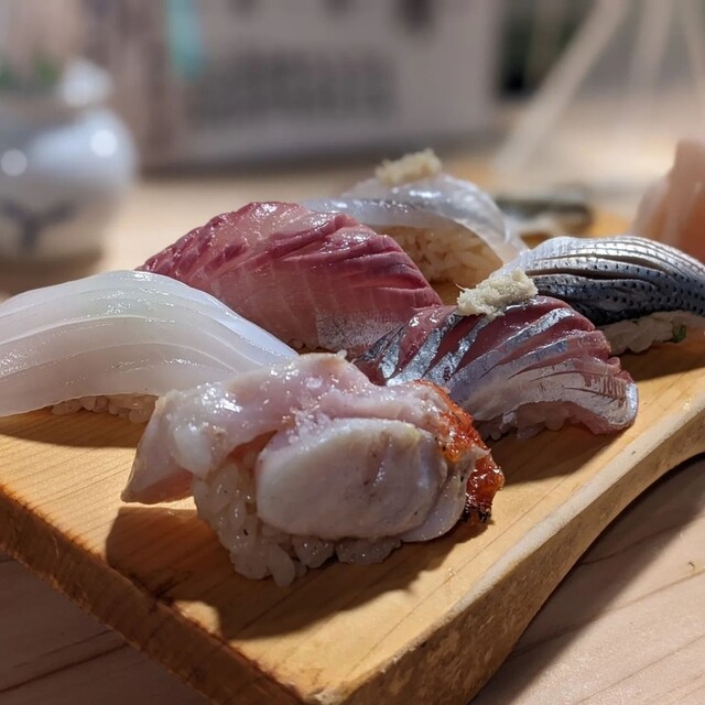 (春子鯛、アジ、アオヤギ、炙り太刀魚)