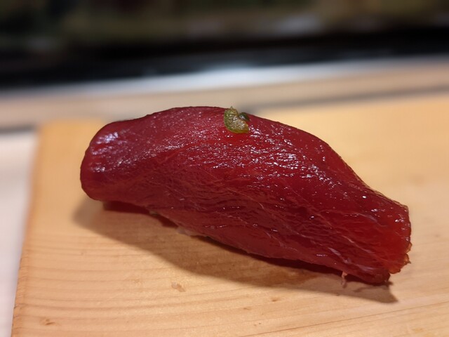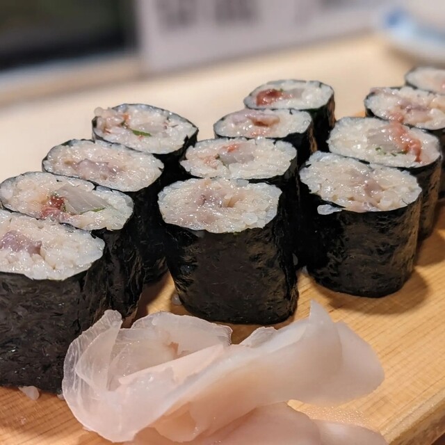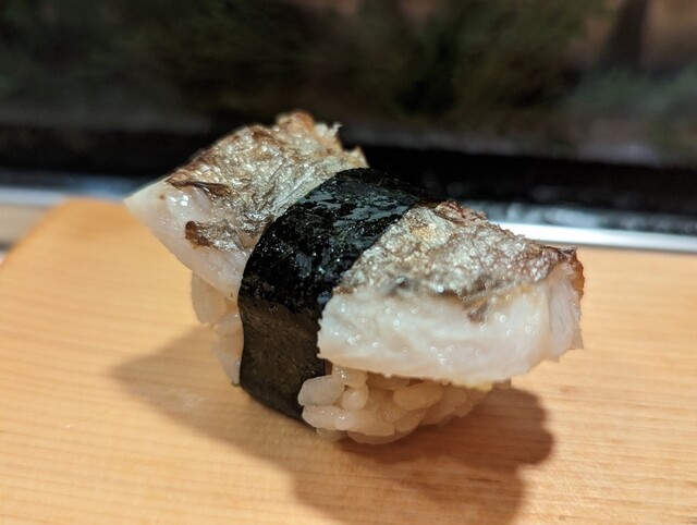 やはり小田原のアジは本当に美味しいです。片身が丁度1貫になるサイズです。アジの身の旨さがとても感じられる柔らかい身とシャリが相まって最高の一貫でした。
