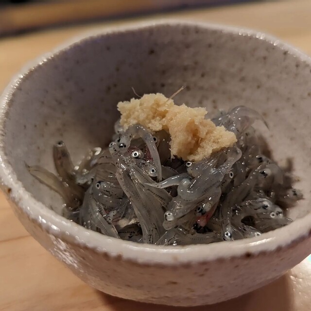 ・お通し(生シラス)自分の希望で生酢を掛けてもらいます。さっぱりとしてとても美味しく頂けます
