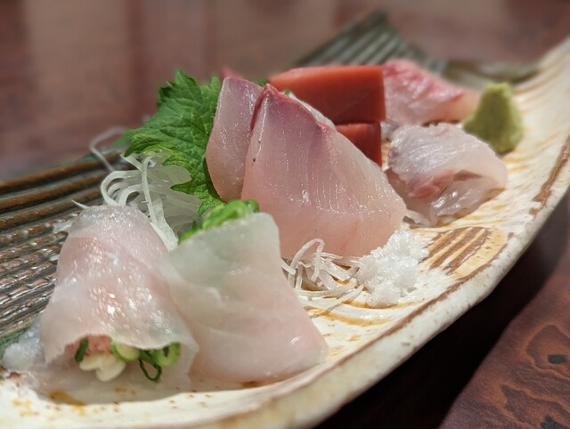 お刺身盛り合わせ(炙り鰆、タコ、石鯛、皮付き太刀魚、ヒラメ)