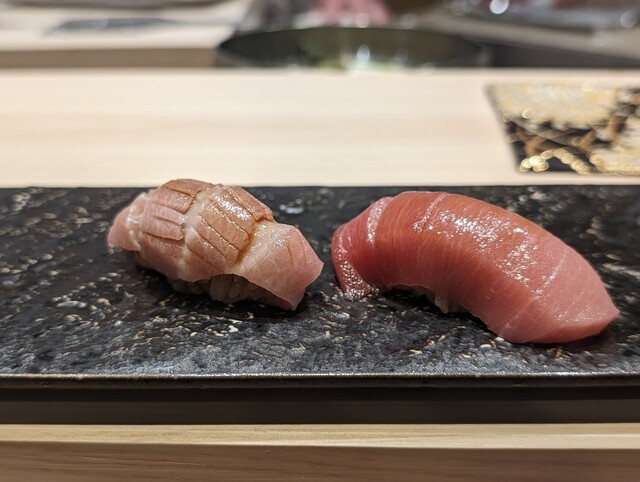 ①塩釜産・延縄・4日間乾燥熟成、②大間産・一本釣り・90日間乾燥熟成の2種類の中トロの食べ比べでした。