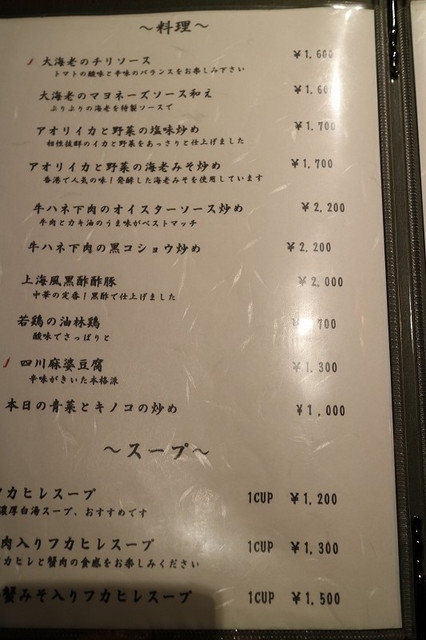 お料理は全体的にものすごく凝ってて、すごい食材は使わずにここまで美味しくできるってのは料理人の腕前だと思う。お値段もサービス料・税込みで5500円とものすごく安いと思った。