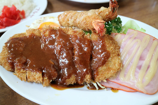 チキンはからりと揚がっており、モモのジューシーさがサクッ!ジュワーで大変美味しい。デミグラスは特筆して美味しいわけでもなく相変わらずなんだが、エビフライは毎回美味いなぁ、齧るといい香りがするんよな。上に掛かっている謎マヨネーズソースもよう分からんが美味しい