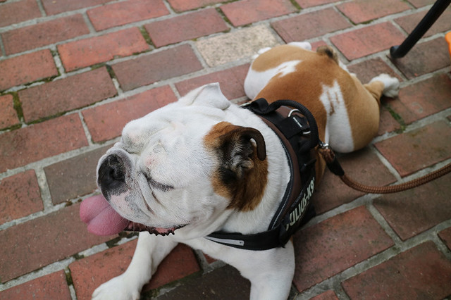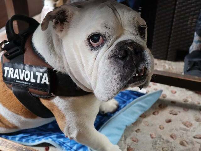 トラボルタは老犬で鼻ぺちゃなので熱さにめっぽう弱く、涼しいうちに来店しました
