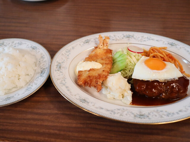 ハンバーグはふんわりした食感でソースも大人しく普通。エビフライもソース合わせて普通。